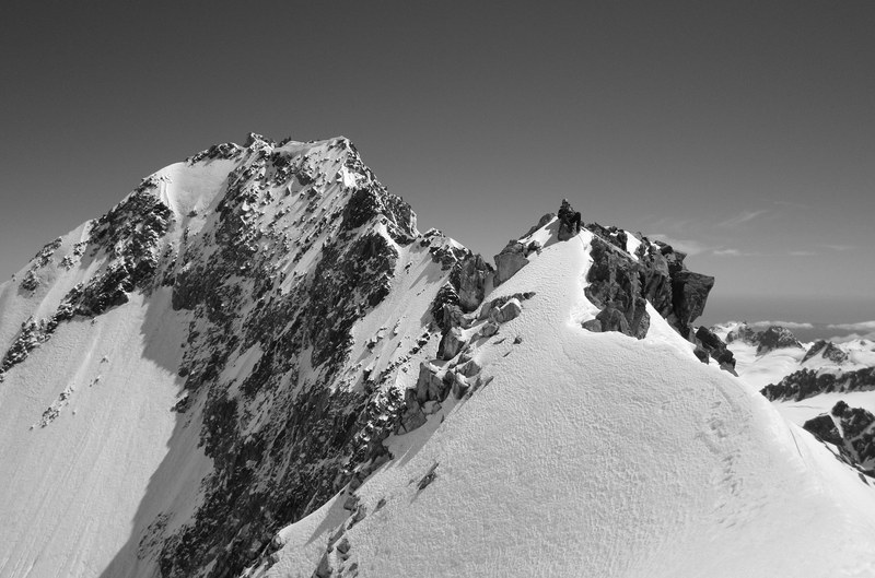 Tinem firul din stanga in mare parte pe zapada. Ajungem la un un fel de diedru spalat intre 2 bolovani de vreun metru si ceva. Pare ceva mic si simplu, dar nu gasesc o solutie evidenta. Prize pentru picioare nu sunt asa ca incerc un fel de bavareza cu coltarii pe o crapatura mica, dar coltarii aluneca ceea ce imi spune ca bavareza nu e tocmai recomandata cand ai coltarii in picioare. La naiba, de ce ma chinui atat pe o chestie asa marunta? M-o fi ajuns oboseala. Incerc din nou cu un sprait larg si reusesc.